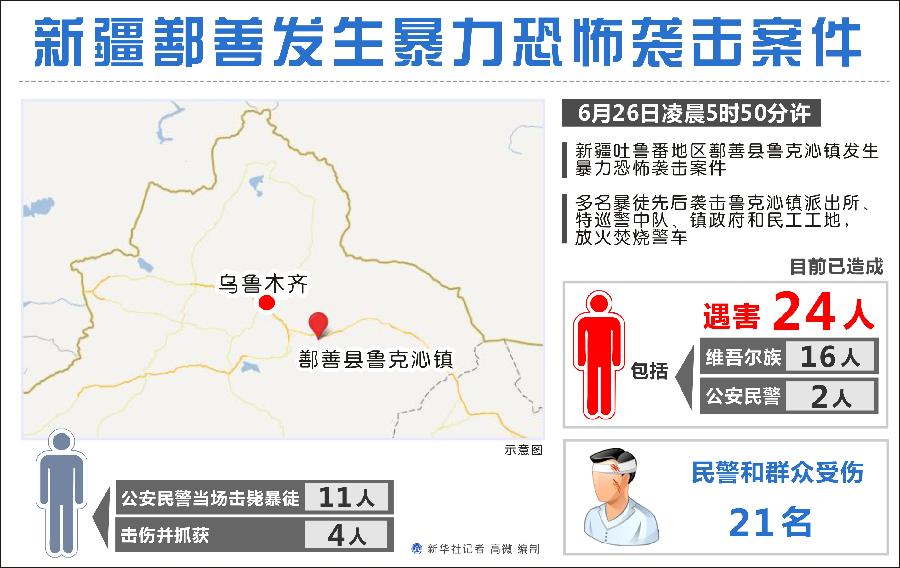 新华网新疆鄯善6月27日电(记者邹伟)26日凌晨5时50分许,新疆吐鲁番地区鄯善县鲁克沁镇发生暴力恐怖袭击案件,多名暴徒先后袭击鲁克沁镇派出所、特巡警中队、镇政府和民工工地,放火焚烧警车。