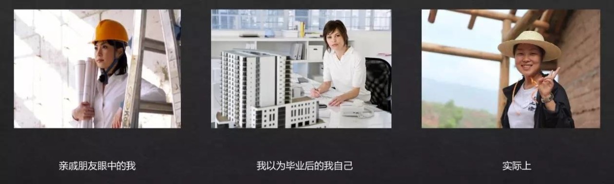 我学建筑的时候,我的亲戚朋友们以为我是像最左边那个图一样:戴个安全帽去盖房子。我自己觉得我以后应该是一个设计师,在一个设计院里面做模型、推敲方案,好像特别高大上的样子。最后发现,我变成了那个戴草帽的样子。——好像画风有点跑偏了。