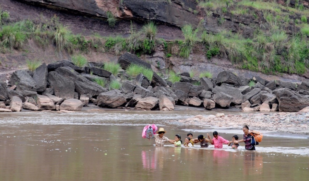 当时村民都是这样来过河的。因为他们很难去外面运砖或水泥之类的材料来重新盖房子,所以他们的重建一直都没有开始,我们去的时候还是这个样子。