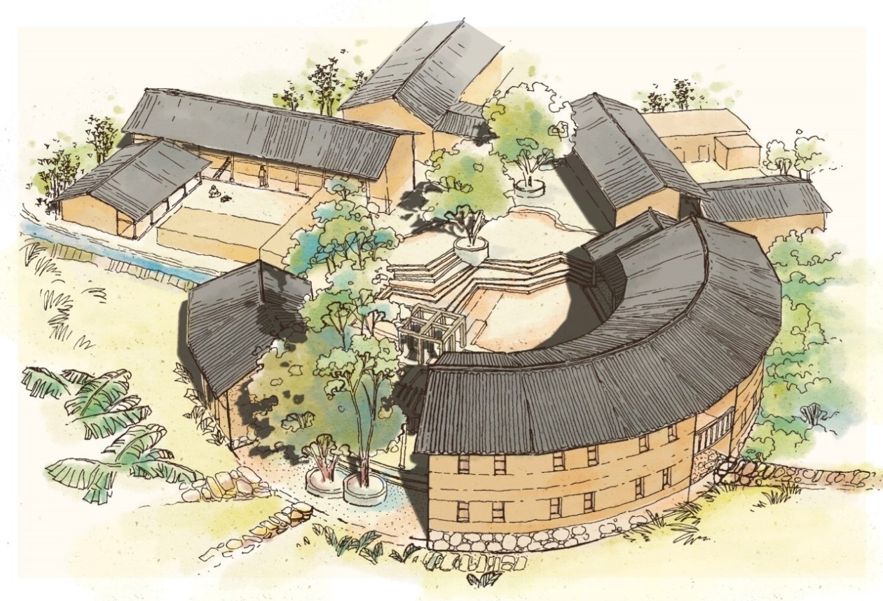 大家是不是觉得有一点像福建的土楼呢?当然我们设计的时候不是为了模仿土楼来设计的。为什么要做一个弧形呢?其实是因为在前阶段重建过程的时候,我们发现当地的村民主要是傣族和彝族,他们特别喜欢在节庆的时候全村人围成一个大圈跳舞。