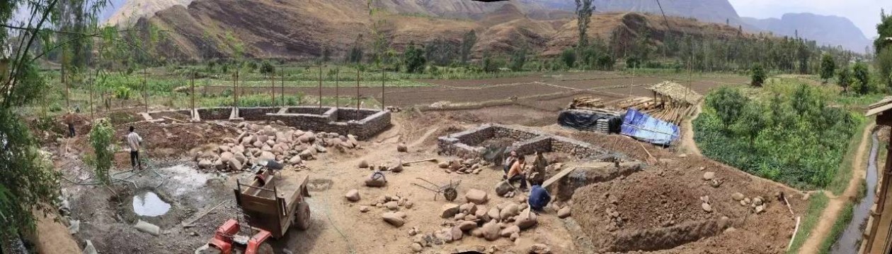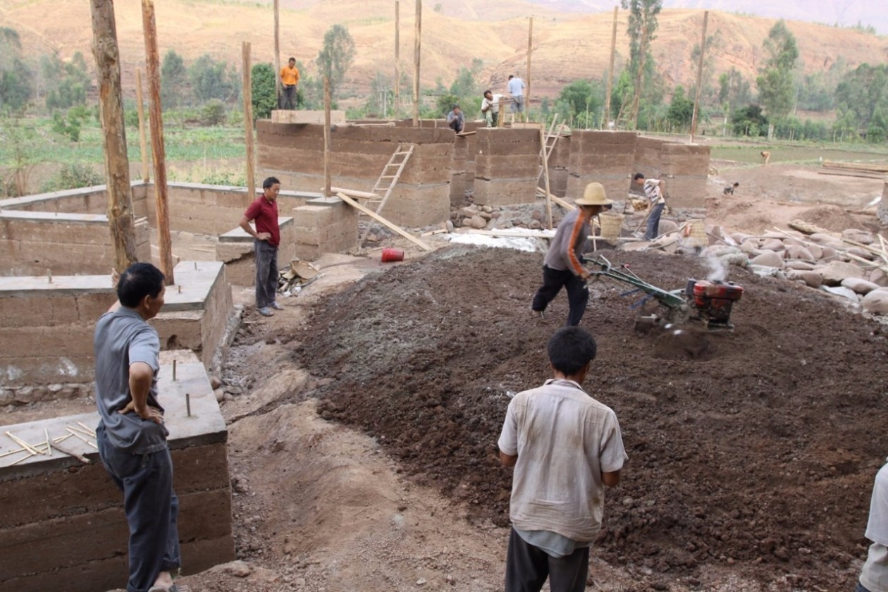 2009年4月份的时候,我就带着和很多老师专家一起讨论好的设计图纸,和杨师傅一起进到这个村子里面。一开始的时候做基础施工还是比较简单的,但是因为交通实在太不方便了,没有办法去外面租大型的机械,所以大部分的工作都是人力完成的,大部分的材料都是就地取材。