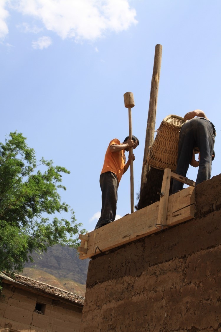 夯墙的话他们是用人力夯筑的。他们的夯锤两头都是木头的,我们做了一点改变,把它的一头变成铁的,这样夯的时候就会比较密实。这个土是他们用背篓一篓一篓地背上去的,所以夯到越高的时候就越费劲。但其实他们经年累月都是这样盖房子,所以他们反而很沉着,驾轻就熟,慢慢按部就班地就把它盖起来了。