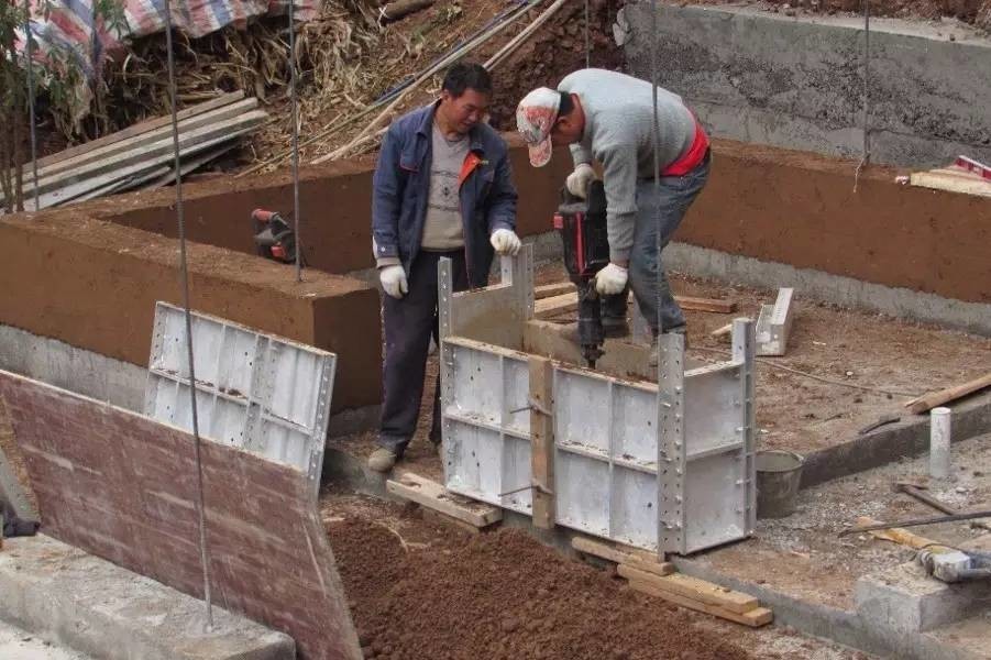 在技术上我们也进一步地改良。这次我们就有条件去用一些小型的夯土机械。这个夯土机械夯实的力度是很大的,如果我们用传统的木模板的话很容易就变形了,所以这次我们也换成了这种铝合金的模板。