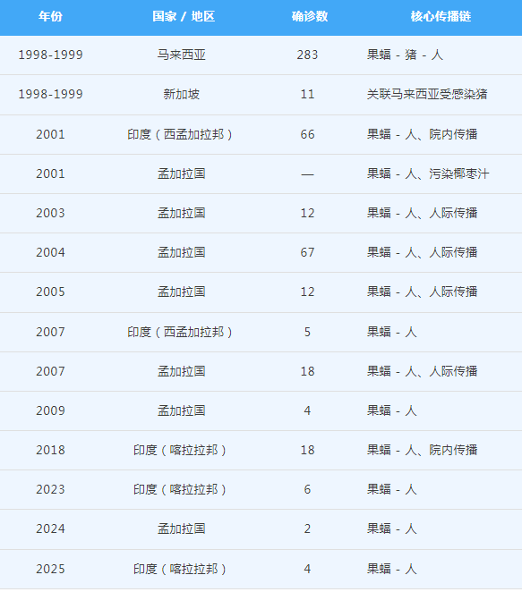 病毒的人际传播效率远低于流感等呼吸道传染病。该病毒发现至今20多年,在上述南亚和东南亚国家均未形成规模性疫情。