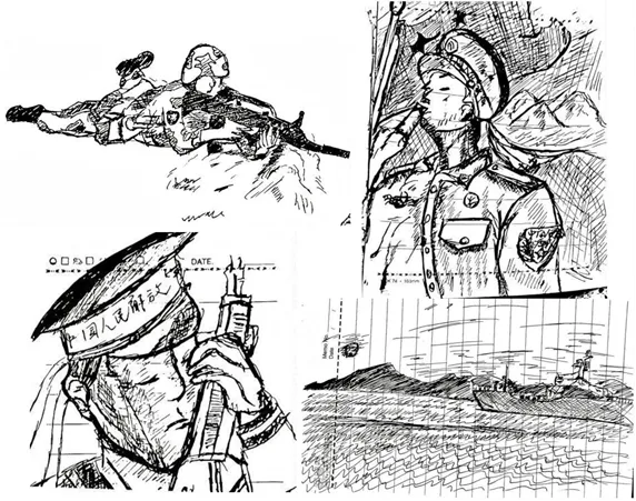 他的日记里,有摘抄军旅歌曲《假如今天战争爆发》的歌词,有他整理的“军人常识”,有他记录的“刺杀操”“军体拳”的动作要领,有“枪不会自己射出,需要勇敢的心和强力的手”的名人名言,还有不少与军旅生活相关的手绘。其中一幅他卧姿据枪瞄准的,被金母撕了下来,留作念想。